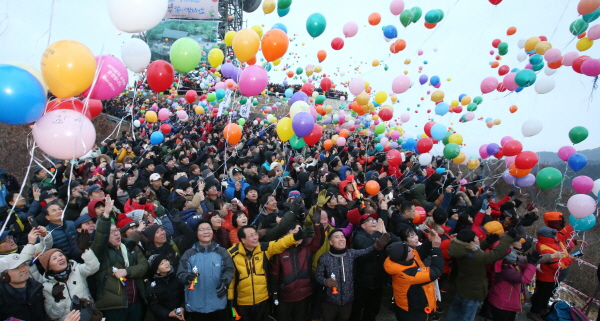 산장산해맞이행사추진위원회(위원장 정헌재)가 주최한 이번 행사에는 지역 주민 2000여명이 참석한 가운데 풍물단 공연, 해맞이 행사, 떡국 제공 등이 진행됐다.