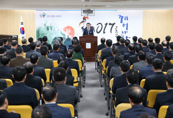 김동일 보령시장이 2일 시청 대회의실에서 간부공무원을 비롯한 전 직원이 참석한 가운데 열린 정유년 새해 시무식을 통해 ▲긍정적인 사고의 적극적인 도전 ▲ 환황해전략사업단 출범과 함께 새로운 각오와 다짐의 글로벌 해양관광 명품보령의 장밋빛 미래 개척 ▲쉬지 않고 노력하는‘자강불식(自强不息)’의 자세를 신년 화두로 제시하고 함께 나아가 줄 것을 주문했다.
