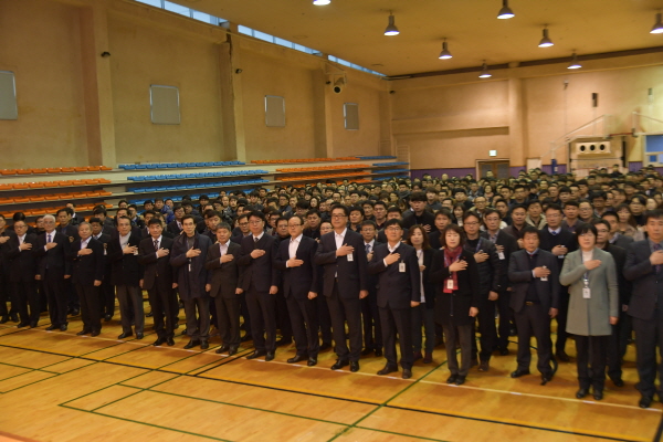 논산시(시장 황명선)는 丁酉年 새해를 맞아 전 직원이 한자리에 모여 2017년 시무식을 갖고 도약과 번영의 힘찬 발걸음을 내디뎠다.