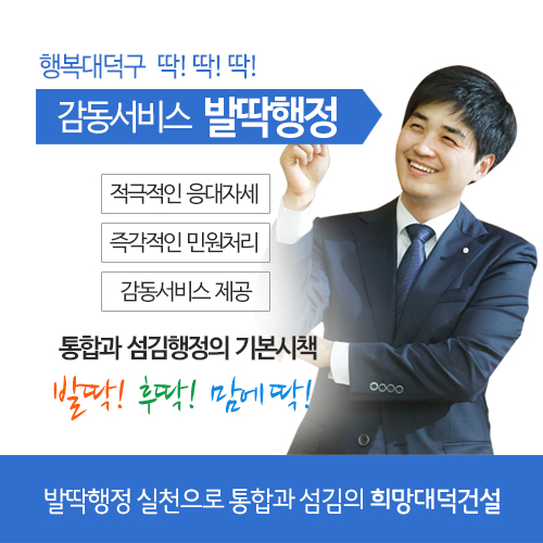 박수범 대덕구청장은 “2017년은 최고의 고객만족 서비스 제공을 위해 대덕구 전 직원이 발딱행정 실천을 위해 움직이는 해”라며 “전국 최고의 친절과 신속한 민원처리로 민원 편의와 감동을 주는 행정서비스를 제공하도록 더욱 매진하겠다”고 강조했다.