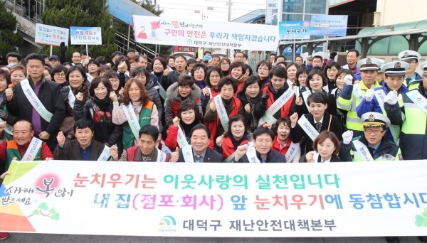 이날 캠페인에서는 대덕구 지역자율방재단, 안전모니터봉사단, 안전실천시민연합회, 모범운전자회대덕지회와 관계 공무원 등 80여명이 참여한 가운데 겨울철 안전사고 발생을 미연에 방지하고자 내집(점포․회사) 앞 눈치우기 운동에 적극 동참과 교통문화운동 등 대대적인 캠페인을 실시했다.