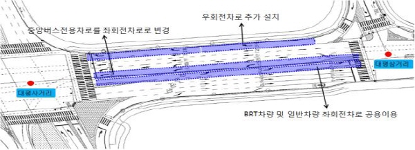 또한, 반대 방향인 대평사거리에서 대평삼거리 방향으로는 중앙버스전용차로를 해제하고, 고속버스터미널 방향으로 일반차량과 비알티(BRT) 차량이 동일하게 좌회전할 수 있도록 차선을 조정했다.