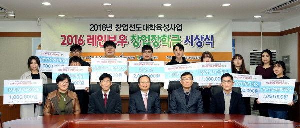 ‘2016 레인보우 창업장학금 수여식’은 4일 대학본부 2층 대회의실에서 열렸다. 수여식에는 최종 수혜대상으로 선정된 40명을 대표해 상위 9명의 학생들이 창업장학금을 수여받았다.