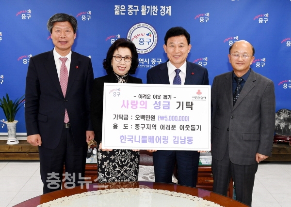 한국니들베어링 김남동 대표는 지난 10일 동절기와 민족고유의 명절인 설을 맞아 어려운 이웃을 위해 써 달라며 대전 중구청을 찾아 성금 500만원을 기탁했다.