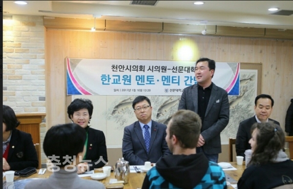 천안시 원성동의 한 식당에서 있었던 이날 행사에는 멘토인 천안시 이종담, 황천순, 김선태, 엄소영, 노희준, 김은나 의원과 멘티인 외국인 유학생 8명이 참석해 했다.