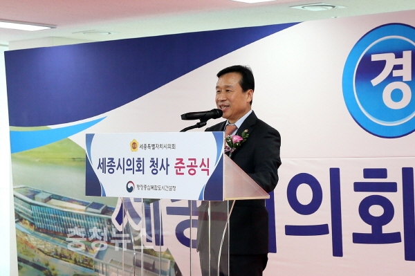 세종시의회청사 준공식에서 이충재 행복청장이 인사말을하고 있다.