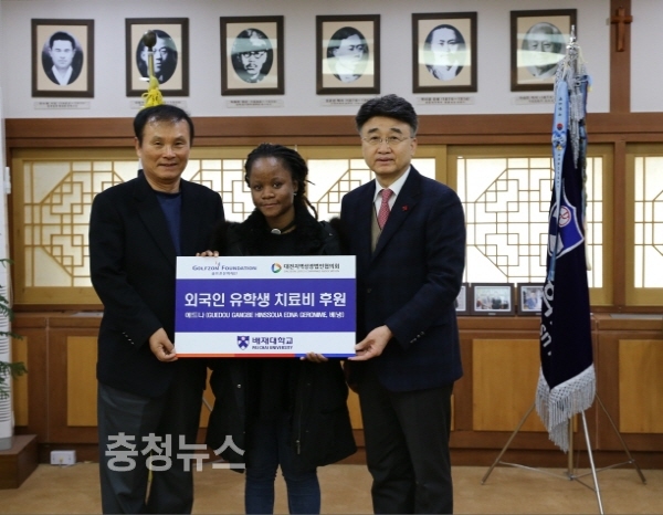 (재)골프존문화재단 김영찬이사장이 오늘 17일, 대전 배재대학교에서 아프리카 베넹(Benin)공화국 출신 유학생 에드나(26,여)에게 1차 수술비와 통원치료기간에 필요한 생활비 1천만원을 전달했다.