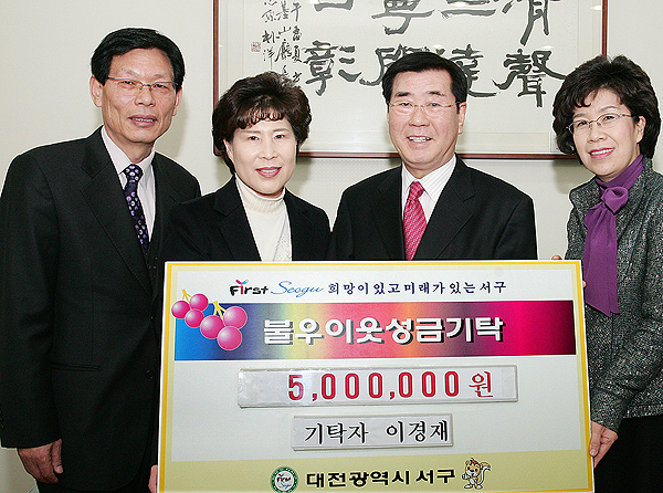 대전광역시 서구 위생행정과에 근무하는 이경재(보건6급)씨는 지난 7일 오전10시 서구청 사랑방에서 불우이웃돕기 성금으로 5백만원을 기탁해 화재가 되고 있다.