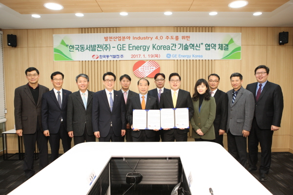 한국동서발전(주)김용진사장은 19일 발전기술개발원에서(충남 당진 소재) 글로벌 인프라 기업인 GE(General Electric)의 에너지 사업부 박장원사장과 “발전산업분야 Industry 4.0주도를 위한 기술혁신 업무협약” 을 체결했다.