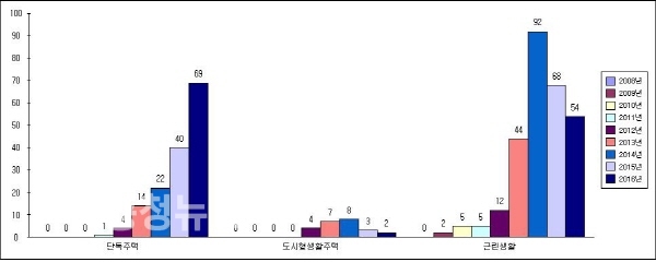 단독주택의 경우에는 2011년 첫 건축인허가 이후 2012년 4건, 2013년 14건, 2014년 22건, 2015년 40건, 2016년 69건으로 지속적인 증가추세에 있다.