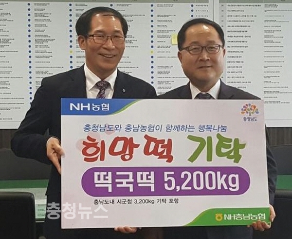 충남농협은 2015년부터 3년째 ‘새해맞이 희망떡 나눔 행사’를 실시하고 있으며 지금까지 떡국떡 20,500kg을 기탁해 사랑의 나눔을 실천하고 있다.