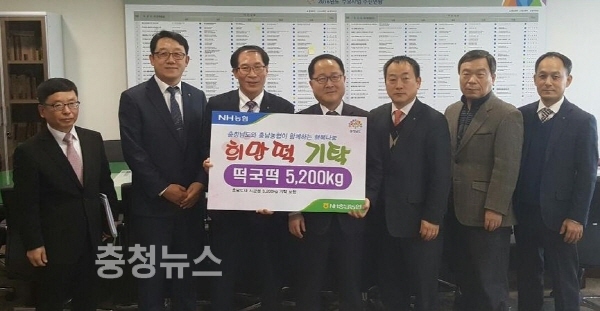 충남농협은 설 명절을 앞두고 23일 충남도청(도지사 안희정)에서 충청남도사회복지협의회에 떡국떡 2,000kg을 전달하는 ‘새해맞이 희망떡 나눔행사’를 실시했다.