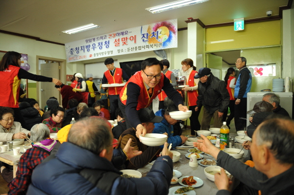 충청지방우정청(청장 이승재)은 25일 우리 민족의 최대 명절인 설을 앞두고 대전시 서구 둔산로에 있는 둔산종합사회복지관에서 어르신 150여명을 대상으로 급식봉사활동을 펼쳤다.