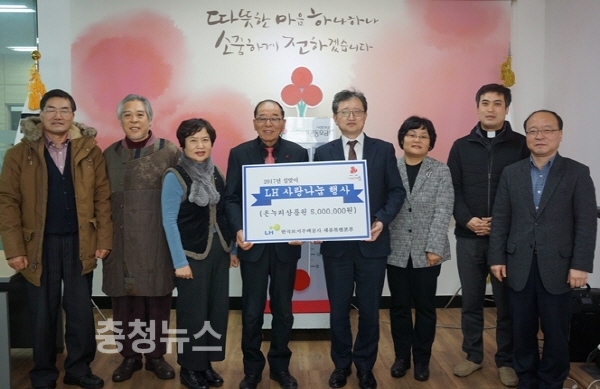 이날 기부금은 세종 사회복지공동모금회를 통해 세종시장애인복지관, 다문화가족지원센터 등 5개 단체에 전달했다. 또한, LH 세종특별본부내 온누리봉사단은 행복도시 밀마루복지마을을 찻아 혼자 살고 있는 어르신들 가정의 주방, 거실 및 방 등을 청소하고, 담소를 나누는 등 사랑나눔 봉사활동을 펼쳤다.