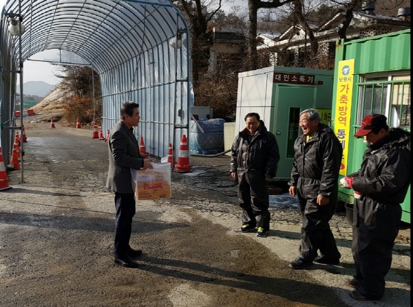 김동일 보령시장이 설 연휴기간인 30일 천북면 신덕리 거점소독시설 등 AI 방역현장을 방문해 근무자를 격려했다.