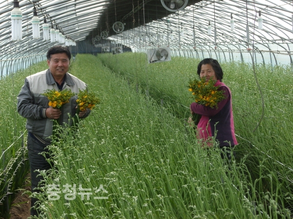 프리지어 출하를 앞두고 양승보 부부가 환하게 웃고 있다