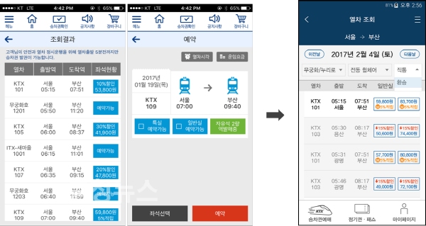 코레일톡+는 우선 사용자가 편리하게 앱을 사용할 수 있도록 화면 이동을 최소화하고, 직관적인 화면 구성으로 예매 단계를 크게 줄이는(10단계 → 7단계)등 열차 정보와 혜택을 한눈에 볼 수 있도록 사용자 경험(UX)에 주안점을 두고 전면 개편했다.