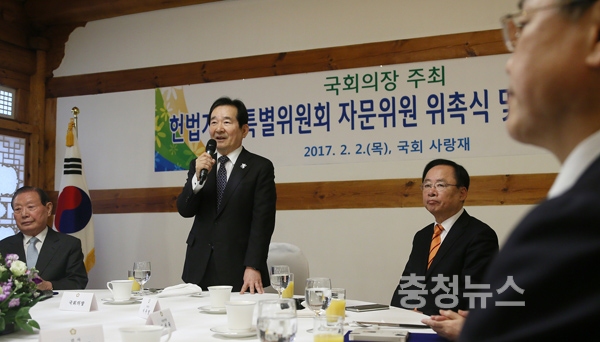 정 의장은 “오늘 모이신 헌법개정특별위원회 자문위원 모두 각계를 대표하는 분들”이라며 “자문위 진용만으로도 20대 국회가 추진하는 이번 개헌은 꼭 성공할 것”이라고 말한 뒤 “특히 두 분의 역대 의장이 자문위원장직을 수락했다는 것은 이번 개헌이 반드시 이루어질 것이라는 의지의 표현이라고 생각한다”고 밝혔다.