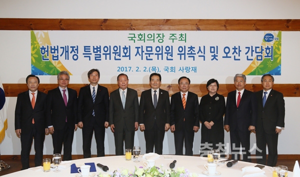 정 의장은 이어 “이번 개헌은 다수 국민이 공감하고 적극 참여하는 ‘국민에 의한, 국민을 위한 상향식 개헌’이 되어야 한다”면서 “국민들과 시민사회의 의견을 잘 수렴해 개헌과정에 반영하는 것이 자문위원들의 역할”이라고 전했다.