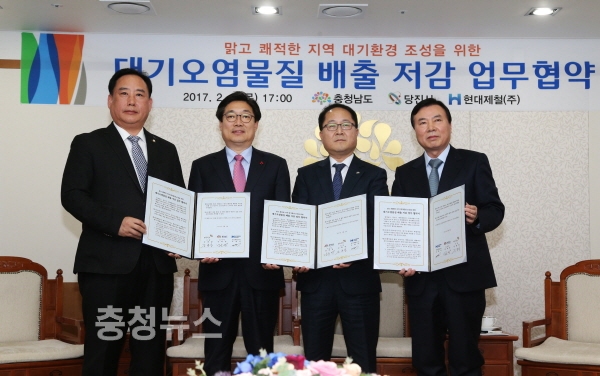 현대제철 대기오염물질 배출저감 협약(왼쪽부터 어기구 국회의원, 김홍장 시장, 행정부지사, 당진제철소장)