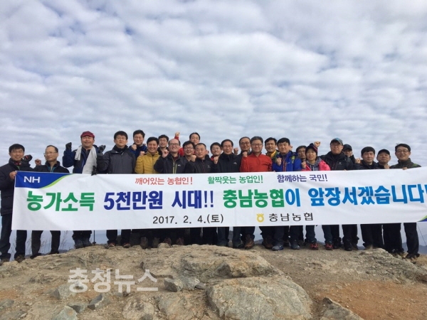 농협 충남지역본부(본부장 유찬형)는 4일 계룡산에서 단장이상 책임자 40여명이 참석한 가운데, 농가소득 5천만원 달성과 1등 충남농협 만들기 위한 ‘사업추진 결의대회’를 개최하였다.