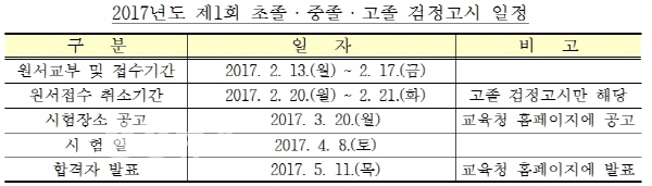 이번 시험은 2017. 4. 8.(토) 전국 동시에 실시되며, 합격자는 2017. 5. 11.(목) 시교육청 홈페이지를 통해 발표할 예정이다.