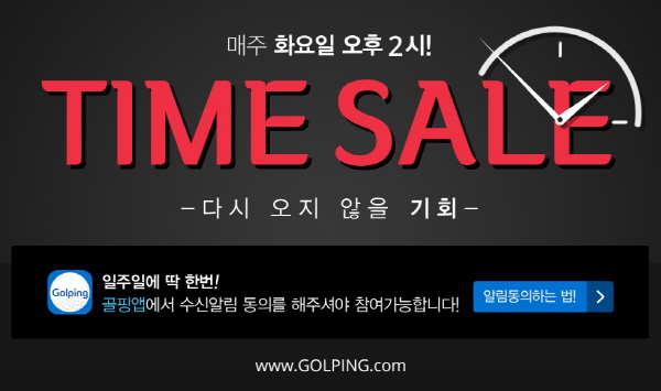 타임세일은 매주 화요일 오후 2시에 진행하며, 매주 바뀌는 한정수량 특가상품을 선착순으로 구매할 수 있다. 이번 타임세일은 모바일 골핑앱 설치 후 ‘쇼핑알림 받기’에 동의한 고객들을 대상으로 진행되며, 더 많은 고객에게 혜택을 제공하기 위해 타임세일 상품은 1인 1회 1개 제품만 구매 가능하다.