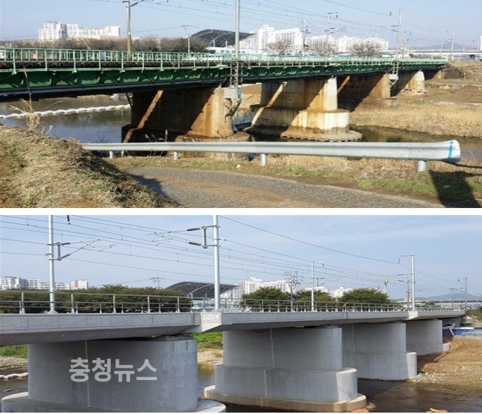 한국철도시설공단 충청본부(본부장 이동렬)는 경부선 철도 조천2교와 심곡천교를 콘크리트 소재로 개량하여 열차 운행선 인근의 소음과 진동을 줄이고 교량 처짐 현상을 최소화했다고 밝혔다.