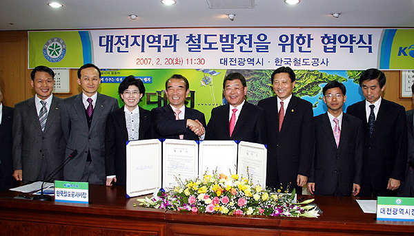 대전시와 한국철도공사는 20일 대전시청 중회의실에서 박성효 시장과 이 철 사장 등이 참석한 가운데 두 기관 현안사업 추진을 위한 교류협약을 체결했다.