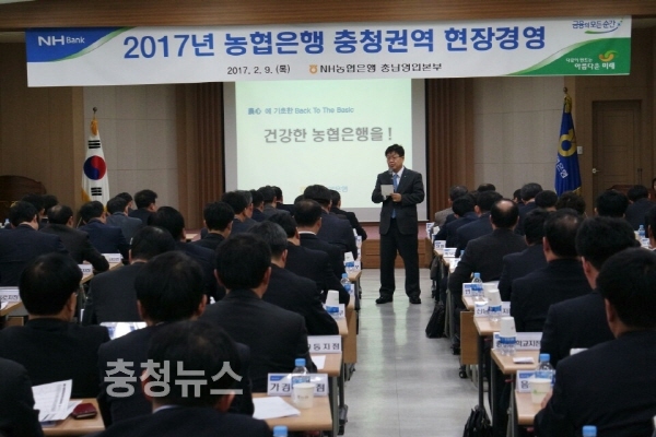 NH농협은행 이경섭 은행장은 9일 충남영업본부 대회의실에서 충남·충북·대전·세종 본부장들을 비롯한 관내 사무소장 등 110여명의 임직원이 참석한 가운데 현장중심 소통 경영 간담회를 가졌다.