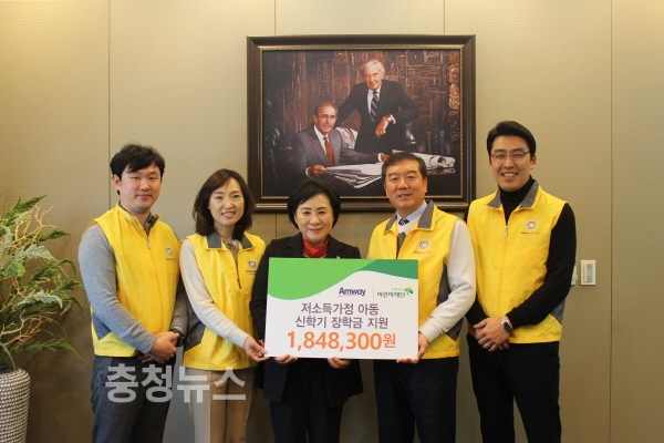 한국암웨이(주) 대전점(지점장 송용성)은 2월 9일 대덕구 비래동에 위치한 초록우산 어린이재단 대전종합사회복지관(관장 유미)에 저소득 가정 신학기 장학금 1,848,300원을 전달했다.