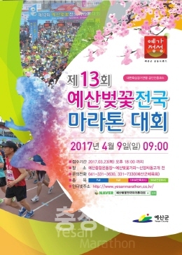 흩날리는 벚꽃잎 사이로 전국 마라톤 동호인들의 레이스가 펼쳐질 예산벚꽃 전국마라톤대회가 오는 4월 9일 일요일에 예산종합운동장에서 개최된다.
