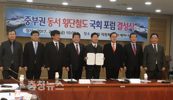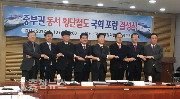 서해부터 동해까지 철도로 연결하는 ‘중부권 동서 횡단철도’의 대선공약화를 위해 충청권과 영남권 국회의원이 정당을 떠나 함께 손을 잡았다.