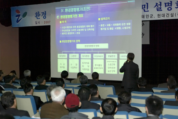 태안군과 현대건설(주), 주민 등 250여명이 참석해 큰 관심을 보여준 이번 설명회는 환경영향평가를 맡은 인정 컨설턴트 최창현 사장과 교통영향평가를 맡은 대건 ENC 우동욱 이사가 참석해 기업도시 건설로 인한 환경 및 교통영향에 대해 대주민 설명을 실시했다.