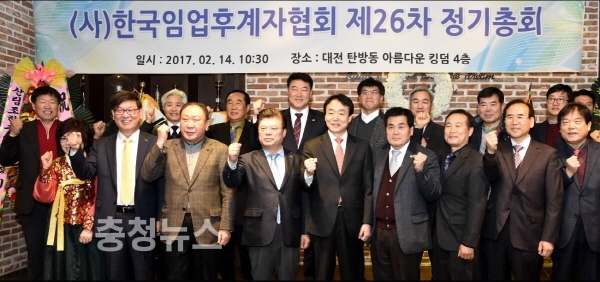 김용하 산림청 차장(앞줄 왼쪽에서 다섯번째)이 14일 대전 서구 탄방동 아름다운킹덤에서 열린 '한국임업후계자협회 제26차 정기총회'에 참석했다.
