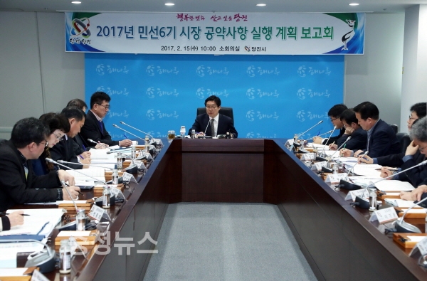 충남 당진시는 15일 김홍장 시장 주재로 부서장들이 참석한 가운데 민선6기 공약사업에 대한 2017년 실행계획 보고회를 개최했다.