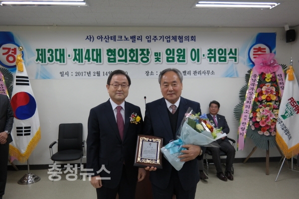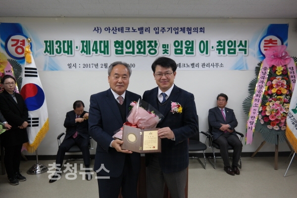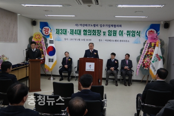 충남 (사)아산테크노밸리 입주기업체협의회 ( 협의회장 신용문, 신라엔지니어링 주식회사 )는 14일 산업단지 관리사무소에서 제3대, 제4대 협의회장 이·취임식을 개최하였다.