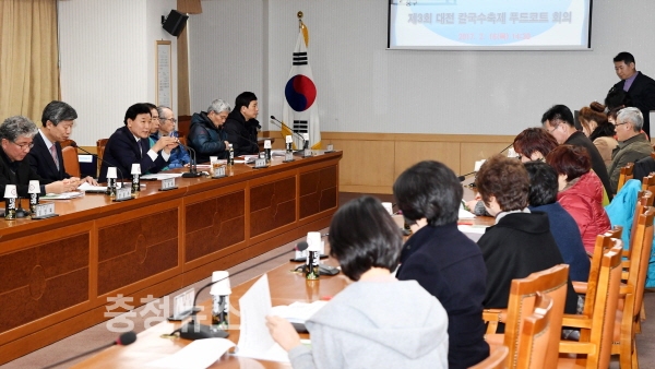 대전 중구 박용갑 청장은 16일 중회의실에서 오는 4월 7일부터 사흘간 개최되는 제3회 대전칼국수 축제를 앞두고 푸드코트 참여업소 대표자 등 20여 명이 참석한 가운데 푸드코트 운영 관련 사항에 대한 회의를 개최했다.