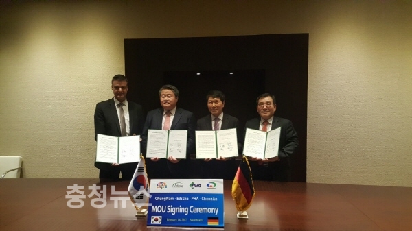 협약식에는 김영범 충청남도 경제산업실장, 이성규 천안시 산업환경국장, 독일 에차社 토슨 그라이너(Torsten Greiner) CEO, 평화공정社 이재승 대표이사가 참석했다.