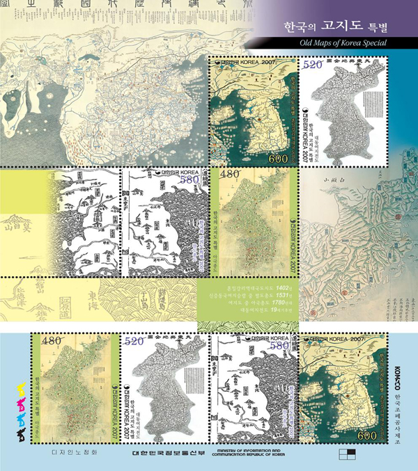 종별로 각 30만 장씩 총 120만 장이 발행되었고, 전지는 소형시트 형태와 전지 형태가 혼합된 시틀릿형 8장(4×1+4)으로 구성되어 있다.  디자인은 아국총도,대동여지전도,팔도총도,혼일강리역대국도지도이다.