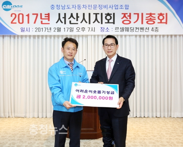 충남자동차전문정비사업조합 서산지회에서는 17일 르셀 웨딩켄벤션에서 정기총회를 열고 회원들이 십시일반으로 마련한 불우이웃 돕기 성금 200만원을 서산시에 전달했다.
