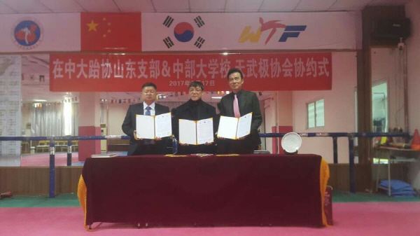 중부대학교(총장 홍승용) 경찰경호학부 경호융합보안학전공(구 경찰경호학과)은 지난 17일 중국 산동성에서 재중국 태권도협회 산동성 지회, 사단법인 프로태권도협회(천무극) 등과 국제교류 업무협약을 체결했다고 밝혔다.