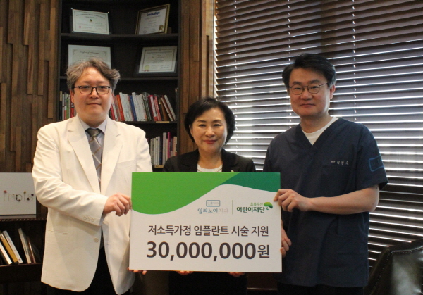 초록우산 어린이재단 대전종합사회복지관(관장 유미)은 20일 서구 둔산동에 위치한 일리노이치과(대표원장 김구현, 임창오(http://www.1edent.co.kr))와 ‘저소득가정 가장 임플란트 무료 시술 지원’ 전달식을 가졌다.