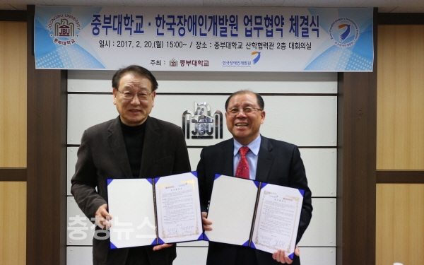 대전광역시발달장애인지원센터 위탁운영기관인 한국장애인개발원(원장 황화성)과 중부대학교(총장 홍승용)는 장애인 복지와 교육의 조사·연구·평가 및 정책개발, 복지진흥, 자립지원 등을 협력하는 내용의 업무협약을 체결했다.