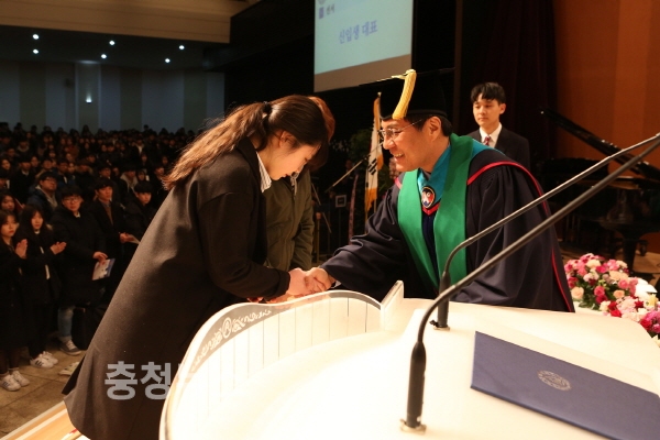 한남대 입학식에서 이덕훈 총장이 신입생에게 성적우수장학증서를 수여하고 있다.