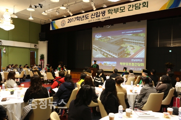 한남대는 입학식 후 총장을 비롯해 교무위원들이 참석한 가운데 학부모 초청 간담회를 한남글로벌센터에서 개최하고, 자녀들의 성공적인 대학생활을 위한 안내 및 학부모들과의 소통의 시간을 가졌다.