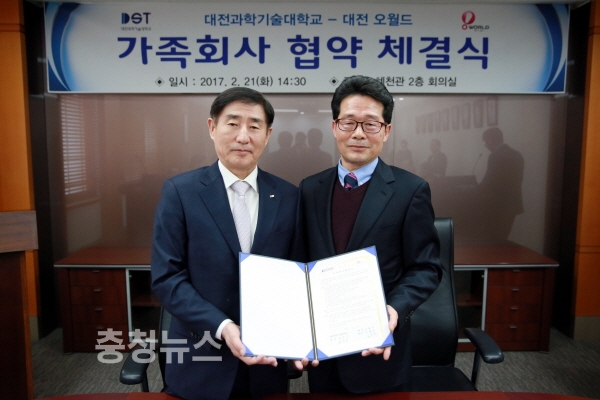 대전과학기술대학교(총장 김은기)는 21일 혜천관 2층 회의실에서 대전오월드(원장 김홍준)와 산학협력 체계구축을 위한 가족회사 협약을 체결하였다.