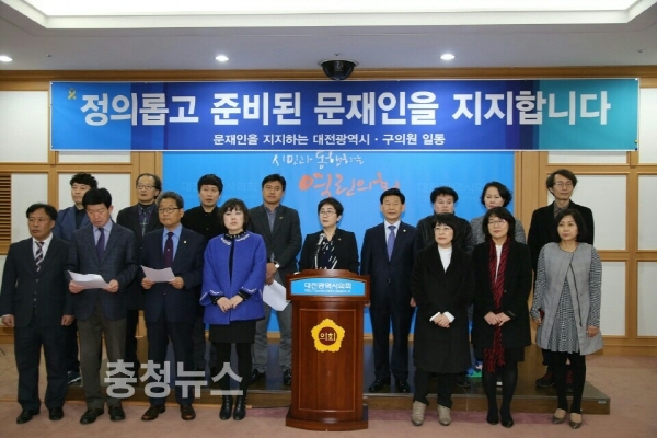 문재인 후보를 지지하는 더불어민주당 소속 대전 지역 광역ㆍ기초의원들의 지지 선언이 22일 대전시의회에서 열렸다.