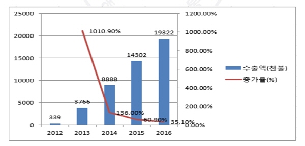 < 어육소시지 수출액 및 증가율 변화 추이(2012-2016) >