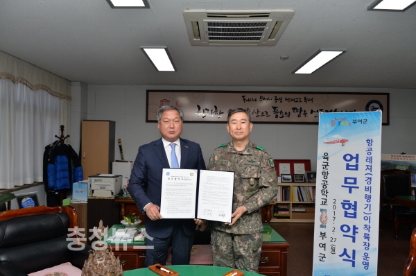 충남 부여군은 지난 27일 육군항공학교(준장 이상윤)와 항공레저 경비행기 이착륙장 운영 활성화를 위한 업무협약을 체결했다.